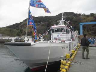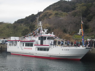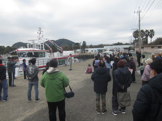 加唐汽船事務所の社長の坂本様から、「現在のかから丸は運行開始から26年がたちます。4月からは新しいかから丸が運航開始になります。安全な運航をしていきます」との挨拶がありました。