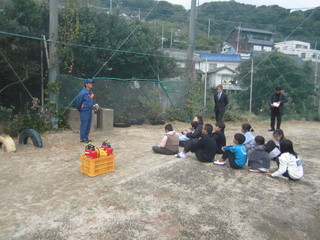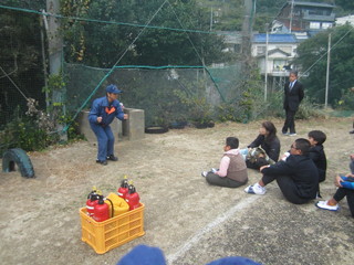 今日は唐津消防署北部分署から2名来校されて、避難の様子や地震の時の対応、炎や煙の怖さ、消火器の使い方など詳しく教えていただきました。