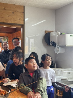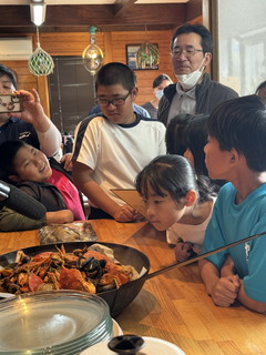 今日は松島へ渡って島内清掃を行いました。燃えるゴミ・燃えないゴミをみんなでたくさん集めて、松島をきれいにしました。そのあと、松島分校に通われて加唐中学校を卒業された宗 勇人さんより、職業講話ということでお話しいただきました。レストランに入ると、すでにいい匂いが部屋いっぱいに満ちていて、清掃活動をがんばった子どもたちからは思わず「おいしそうー!」と声がもれていました。