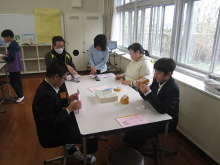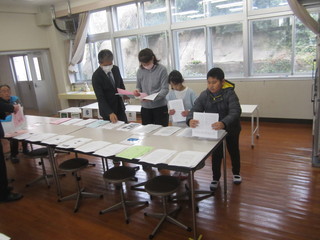 今日は児童生徒のみんな、保護者のみなさん、先生方で書いた原稿をまとめた、加唐小中学校恒例の文集「島風」の製本作業をランチルームで行いました。
