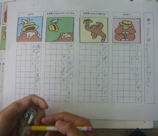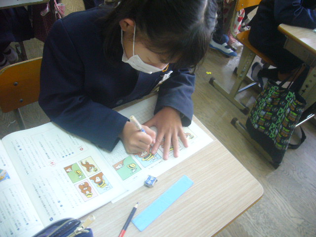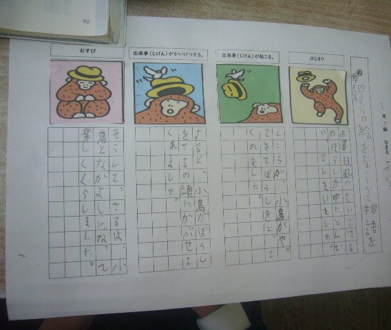 HOME > お便り > フォトギャラリー > 1/21研究授業_3年生 1/21研究授業_3年生 入力日2026年1月21日 閲覧数71 3年3組で国語科の研究授業がありました。「4枚の絵を使って」という単元の授業でした。サルとハトが出てくる4枚の絵を使って短い物語を自由に書いていくのですが、4枚の絵の並べ方は自由なので、何通りもの物語が生まれていました。次回は作った物語を紹介し合う活動になります。 前へ 一覧へ戻る 次へ
