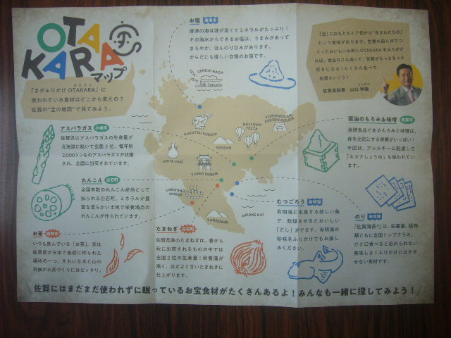 ニュースにもなっていますが、「さがふりかけOTAKARA」(「だいちのOTAKARA」「うみのOTAKARA」「すんごいOTAKARA」)が開発されました。これは、まだ食べられるのに捨てられそうになった食べ物を集めて作った特別なふりかけです。このふりかけは、佐賀県が老舗の醤油会社や県立高校と連携して開発したもので、今年は、上峰小の6年生をはじめとする県内の17の学校にトライアルとして3種類のふりかけが配布されました。今後、県内全校配布を目指すとのことです。