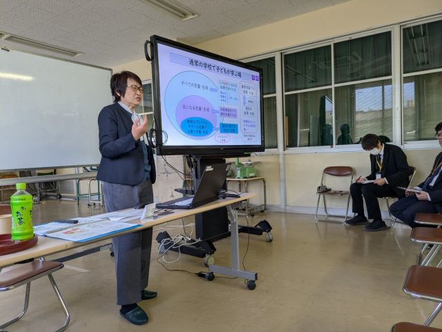 HOME > お便り > フォトギャラリー > 12/11特別支援教育研修 12/11特別支援教育研修 入力日2025年12月11日 閲覧数102 昨日の午後、西九州大学特任教授の日野久美子先生をお招きして、特別支援教育に関する研修会を開催しました。上峰小の先生たち、支援員さん、町教委の方、町内の幼稚園と子ども園の先生の参加もありました。中学校の先生にもリモートで参加していただきました。子供たちの多様な実態に応じられる教育システムを準備することで、どの子も困らない教育を目指しましょうというお話でした。 前へ 一覧へ戻る 次へ