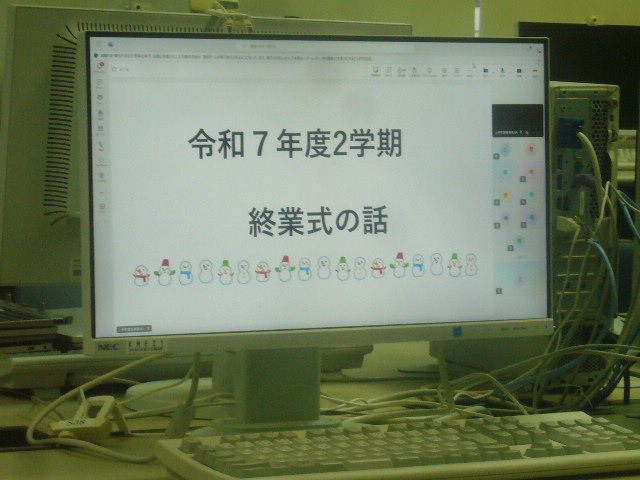HOME > お便り > フォトギャラリー > 12/24終業式とサンタさん 12/24終業式とサンタさん 入力日2025年12月24日 閲覧数70 今日は2学期の終業式でした。インフルエンザの罹患者が増えているので、リモートで各教室からの参加にしました。終業式後には、冬休みの生活についての話と表彰がありました。楽しいイベントが多い冬休みですが、生活のリズムや交通ルールを守り、お金やインターネットの使い方を家の人と一緒に考えながら過ごして欲しいと思います。 終業式のあとには、7人のサンタさんから子供たちにプレゼントが配られました。 前へ 一覧へ戻る 次へ