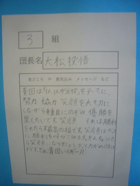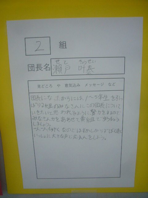 HOME > お便り > フォトギャラリー > 9/19「心を燃やせ」赤黄青 9/19「心を燃やせ」赤黄青 入力日2025年9月19日 閲覧数125 「心を燃やせ」のスローガンで取り組む今年の体育大会ですが、赤組・黄組・青組の3人の団長に体育大会への意気込みや下級生へのメッセージを書いてもらいました。学校だよりでも紹介しています。 前へ 一覧へ戻る 次へ