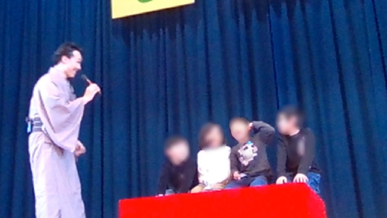 「牛褒め」のお話では、絶妙な言い間違いに子どもたちが大笑いしていました。また、手ぬぐいと扇子を何に見立てているかのクイズ、じゃんけんに勝った4人の子どもたちがわん丈師匠と掛け合いをするなど、大変盛り上がりました。