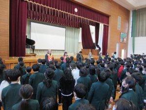 HOME > 活動の様子 > 校内スケッチ > 感謝の会 ~地域の方へ~ 感謝の会 ~地域の方へ~ 入力日2026年2月4日 閲覧数100 2月3日(火)、日頃から児童の安心・安全を守ってくださる見守り隊の方と、素敵な読み語りの時間で心をポカポカにしていただいている読み語りボランティア「おひさま」の方を招待しました。 児童の感謝の気持ちを表す1年生手作りのメダルと全校児童の校歌斉唱をプレゼントしました。 前へ 一覧へ戻る 次へ