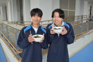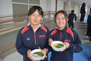 HOME > 学校の様子 > 入力日2025年12月18日 閲覧数29 12月16日にうどん会が開催されました。 クラスマッチで疲れた生徒たちに、後援会の皆様よりおいしいうどんをふるまっていただきました。 生徒たちはうどんを食べて、午後のクラスマッチ決勝も全力で取り組んでいました。 一覧へ戻る 次へ