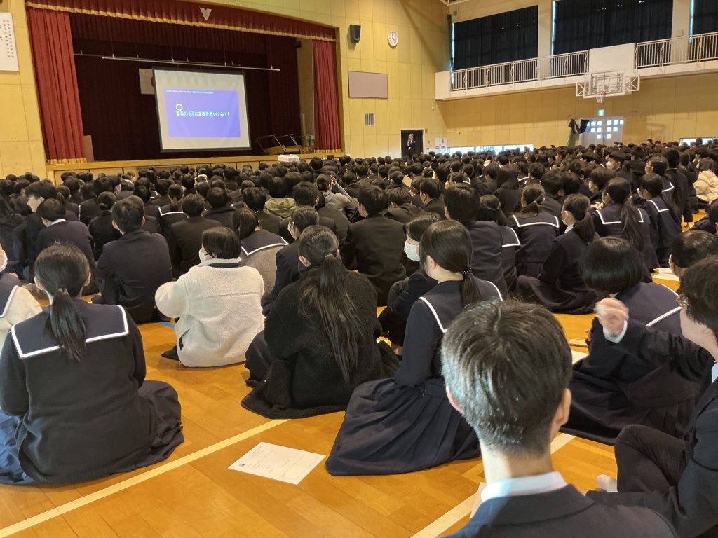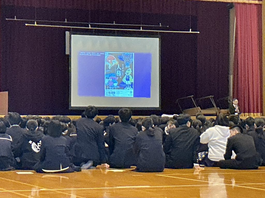 12月12日(金)7限目に、人権・同和教育講演会が実施され、高校生全員が人権について学びました。講師は、有田工業高校の教頭 永益和弘先生です。「バージョンアップできていますか?」という演題で、クイズも交えながら、人権や差別について考える機会を与えてくださいました。