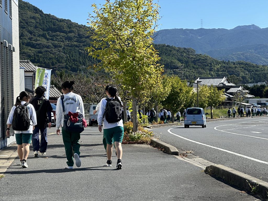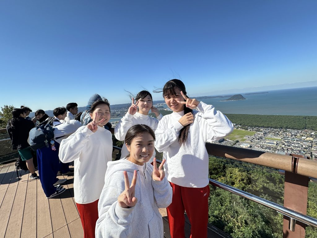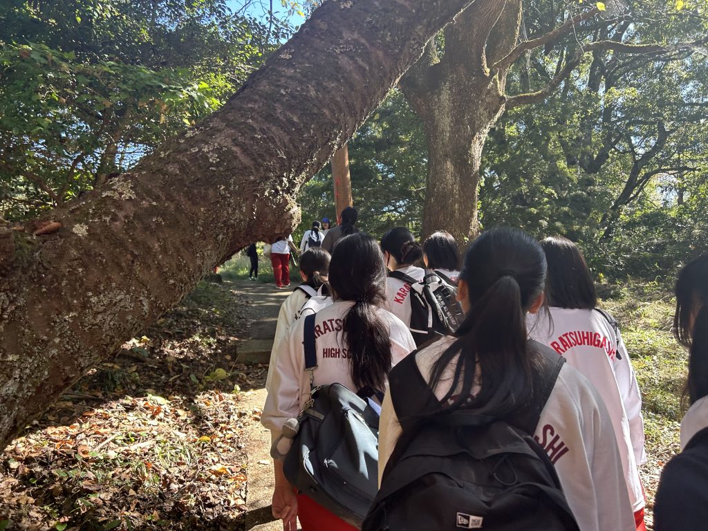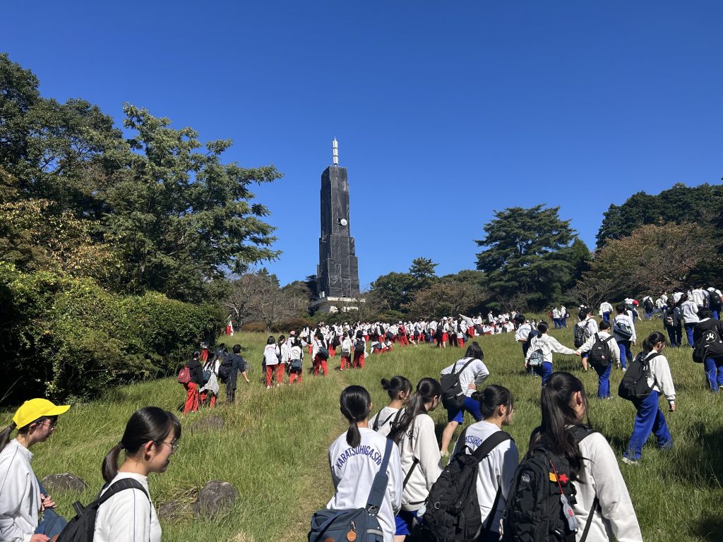 10月29日(水)に本校の開校を記念して、全校生徒による鏡山登山が行われました。天候にも恵まれ、涼しい気候の中、生徒たちは声を掛け合いながら頂上を目指していました。登頂後は生徒会企画も行われ、楽しく充実した時間となりました。