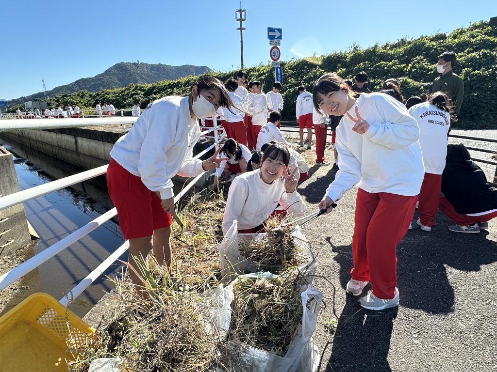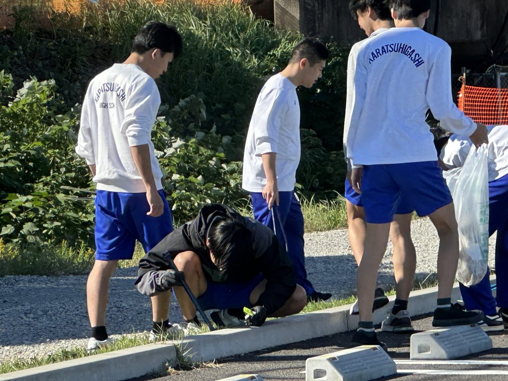 また、今年から環境ボランティアも同日実施となり、中学生は登頂後に鏡山の清掃活動、高校生は登山前に学校内外の清掃活動を行いました。生徒たちは協力しながら草むしりやごみ拾いなどに取り組み、大変ながらも地域をきれいにすることの大切さを感じていたようでした。