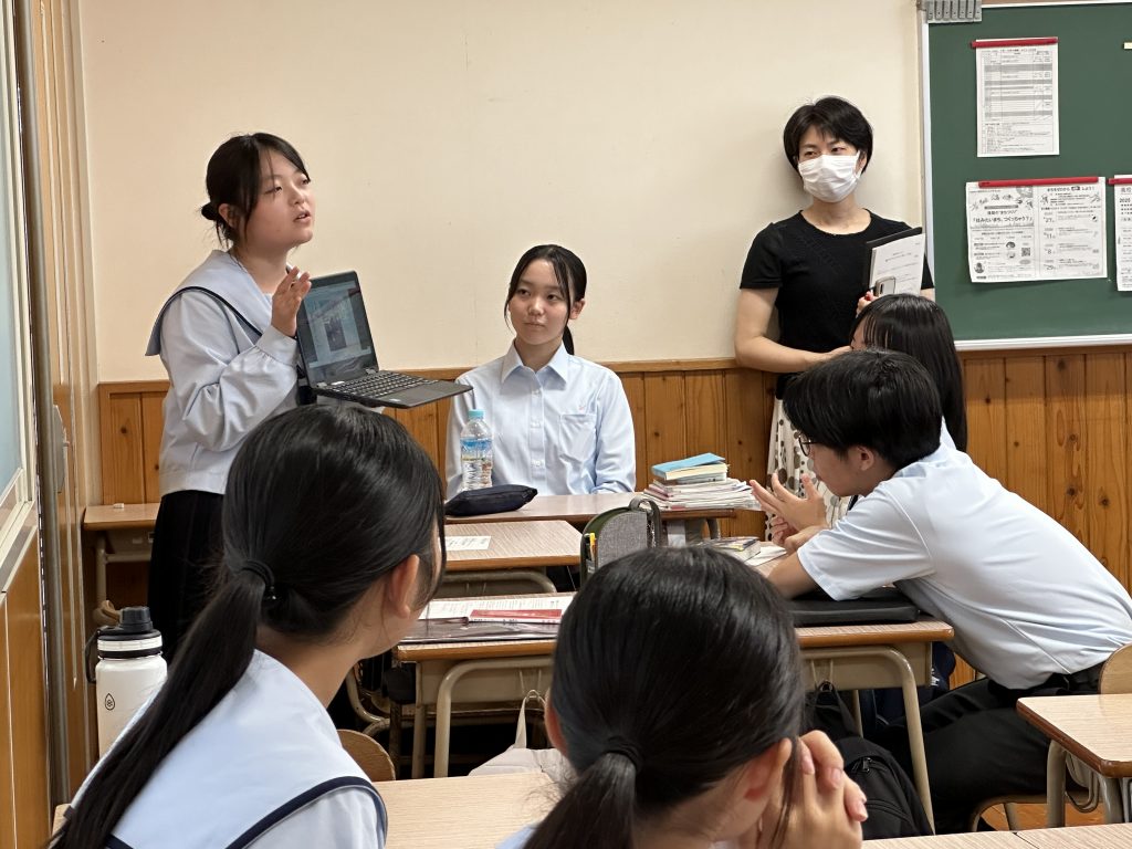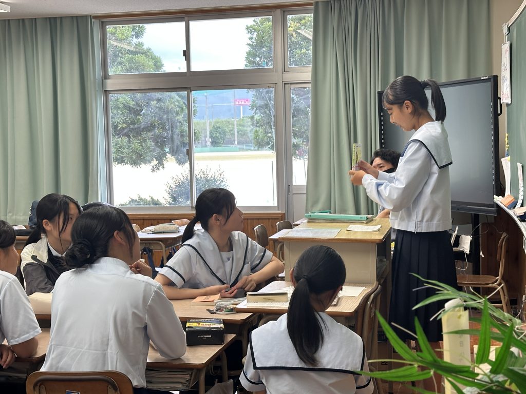 はじめはクラスごとに少人数のグループで発表して代表を決め、さらにその中からクラスの代表者を決めました。クラス全員の前に立ち、緊張していた生徒も、友達の笑顔やうなずきに励まされて、しっかりと自分の思いを伝えることができました。