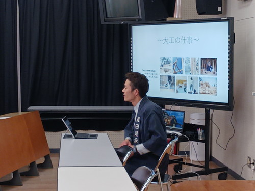 当日は、建設業界で活躍されている3名の講師の方々をお招きし、それぞれの職種について講話をしていただきました。講師の職種は、①施工管理、②大工、③建設ディレクターの3分野です。