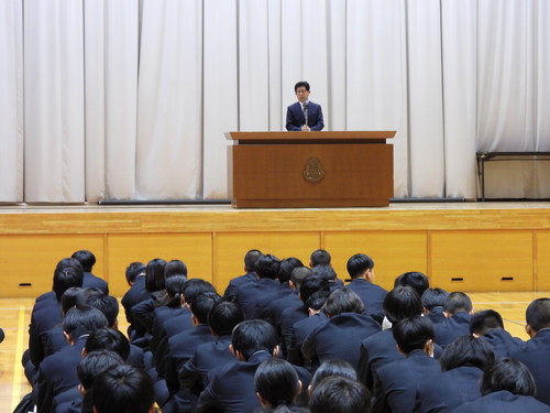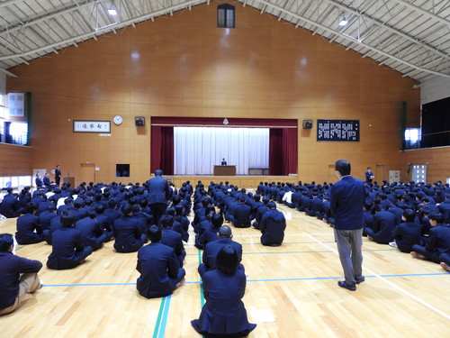 はじめに、神近正学校長から『2学期中は、大きな事故、怪我等がなかった事を喜びたいと思います。そして、みなさんの協力と頑張りにより、とても充実した学校行事、地域貢献や学校PRができました。また、部活動やコンクール、各種競技会での皆さんの活躍を大変嬉しく思います。』と挨拶がありました。