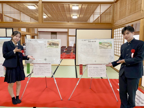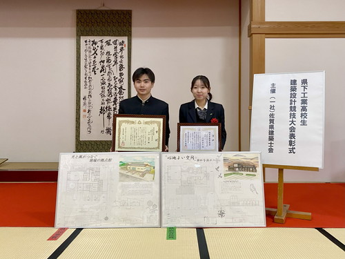 今年度は「気候風土に配慮した地域の公民館」というテーマで、佐賀県内の建築科のある学校より、計115点の応募があり、県内の1級建築士の方々の厳正なる審査の結果、本校、宗田強希さん(建3)が県知事賞を、川添奈々さん(建3)が県教育長賞という最高位の賞を受賞し11月16日(土)に佐賀城本丸歴史館外御書院一之間で授賞式が行われました。