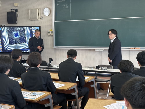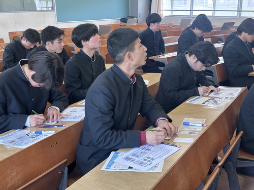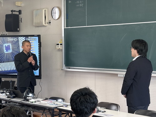 令和8年3月16日(月)に、電気科2年生を対象にSAGAミライシルプロジェクト:「半導体出前講座」と題し、出前授業が実施されました。講師は、国立高専機構 有明高専 創造工学科 人間・福祉工学系 教授 石川洋平先生です。集積回路を作る工程を、4種類の型紙と4色の色鉛筆を使って実際に回路のパターンをデザインする体験を生徒全員が体験しました。そのあと、eスポーツとサーキットデザインということで、7台のパソコンを持ち込まれて、実際にゲーム感覚で、集積回路を作りこむ過程を体験させてもらいました。多くの生徒が、大変興味深くゲームに取り組んでいました。なお、「サーキットデザイン」とは、サーキット(回路)デザイン(設計)の意味で、早期・多世代に向けた半導体・集積回路教育を目的として、石川先生が名づけられました。