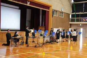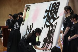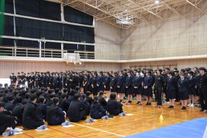 対面式では新入生と在校生が初めて顔を合わせ、緊張した様子の新入生を吹奏楽部の演奏や在校生の拍手で温かく迎えることができました。また、在校生による校歌紹介も行われ、4月に開催される双松祭体育の部でリーダーを務める3年生を中心に全員が大きな声で歌いました。