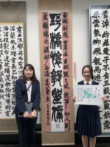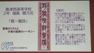 - 内容 - ~努力の花、見事に開花!~ - 第37回佐賀県総合文化祭書道部門 - 特選に輝きました! - 書道部2年福島穂乃花さんが揮毫した作品「葛一龍詩」が300点を超える出品作の中から特選に輝き、次年度全国総文祭秋田大会への推薦を受けました。また、同じく書道部より奨励賞ほか多くの賞を受賞しています。 - 文化部と言えど、書道は体育部並みに体力が求められます。呼吸をするのを忘れるくらい一点一画に集中し、丹念に書き上げるのが書道ですが、うまくいくことは少なく、納得のいく作品ができずに悔しい思いをしたことも何度もあったことでしょう。それでも多くの書道部が受賞できたのは、全員でその苦労を味わい、乗り越えてきたからにほかなりません。今回の快挙は福島さんをはじめ、すべての書道部員が頑張った結果であると感じました。 - 3学期にも作品展やコンクールがあります。自らの技を磨き、仲間と切磋琢磨しながら一層精進してください。今後の活躍を期待します。