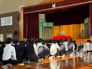 - 内容 - ~ 芸術の秋、日本の古典芸能に触れる ~ - 令和7年度 芸術鑑賞会 - 10月23日(木)芸術鑑賞会を行いました。毎年行っている芸術鑑賞会、今年は日本の古典芸能である落語や講談、和妻を鑑賞しました。生徒からは大きな笑い声や驚きの声が上がり、自国の文化に誇りをもつ機会になりました。 - 落語とかけましてアロマセラピーと説きます。その心は・・・