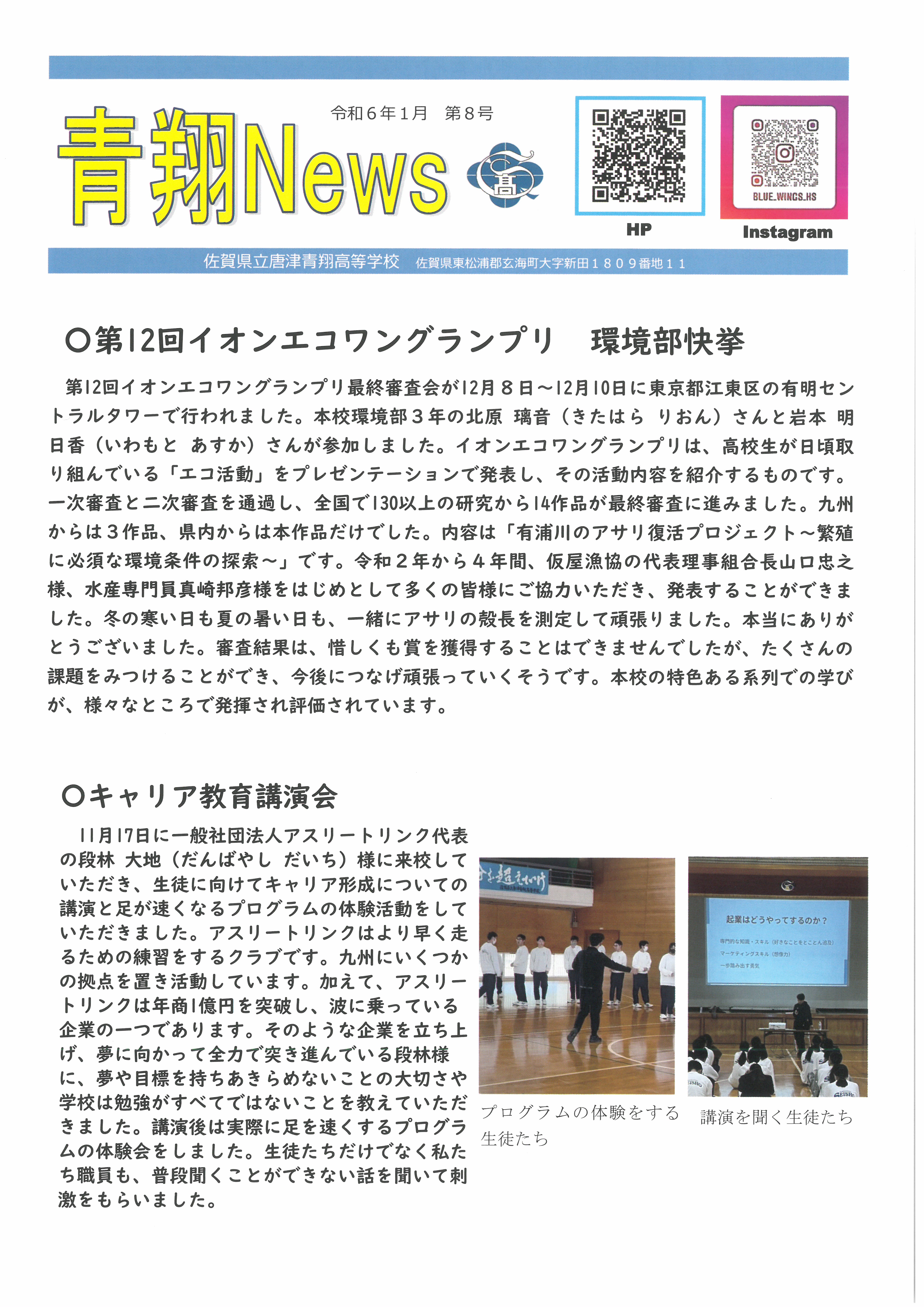 HOME > 学校紹介 > 青翔NEWS(学校広報紙) > 令和5年度第8号 令和5年度第8号 入力日2023年12月27日 内容青翔ニュース第8号 主な内容 ・第12回イオンエコワングランプリについて ・キャリア教育講演会について ・第13回佐賀県高校生介護技術コンテストについて ・系列校外学習について 青翔ニュース_第8号 閲覧数752 前へ 次へ