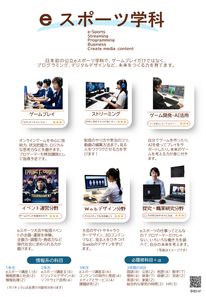 HOME > eスポーツ学科について > 6/10 eスポーツ学科について(概要) 6/10 eスポーツ学科について(概要) 入力日2025年9月19日 内容令和8年4月に、全日制公立高校で日本初となる、eスポーツ学科を開設いたします。学科の概要は下記の通りです。 ▶eスポーツ学科の概要PDFはコチラから 閲覧数88 前へ 次へ