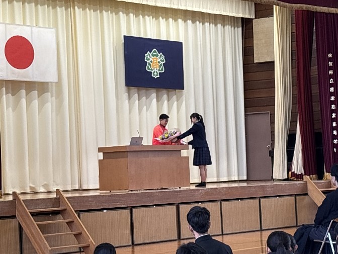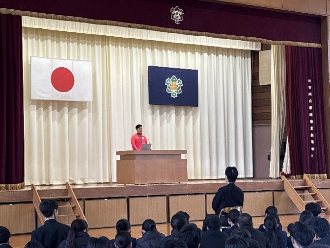 その後、デフリンピック報告会が行われました。11月に行われた東京2025デフリンピックに金持義和選手(平成24年3月本校卒業)が出場され、メダルを獲得されました。これまでの競技人生におけるたくさんの経験から得たことや感じたことなどを生徒達へお話をしていただきました。