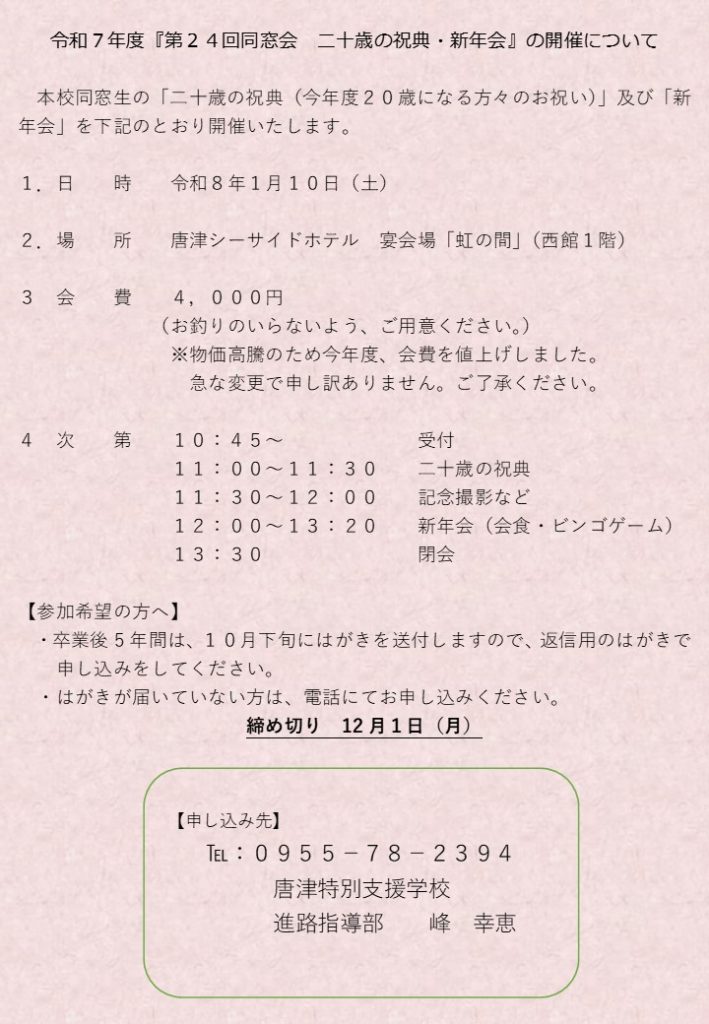 HOME > 分掌部 > 進路指導部 進路指導部 令和7年度『第24回同窓会 二十歳の祝典・新年会』の開催について 保護者対象進路学習会『就業・施設体験について』(資料) 令和7年6月「進路だより」 令和6年5月「進路だより」1号 令和5年 4月「進路だより」№1 令和5年 3月「進路だより」№8 令和5年 2月「進路だより」№7 令和4年12月「進路だより」 №6 令和4年11月「進路だより」 №5 令和4年9月「進路だより」№4 令和4年7月「進路だより」№3 令和4年6月「進路だより」№2 令和4年4月「進路だより」№1 訂正版(6月17日)