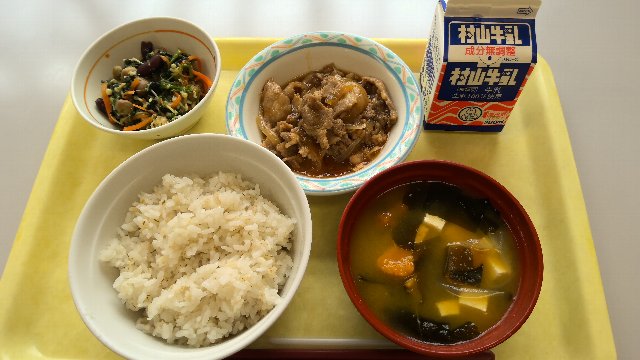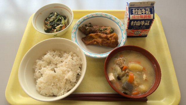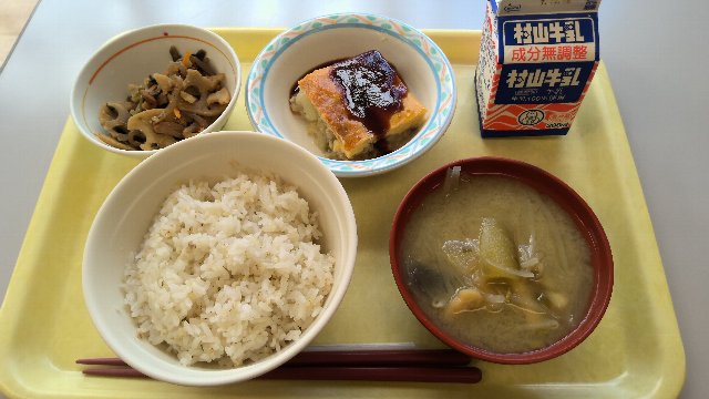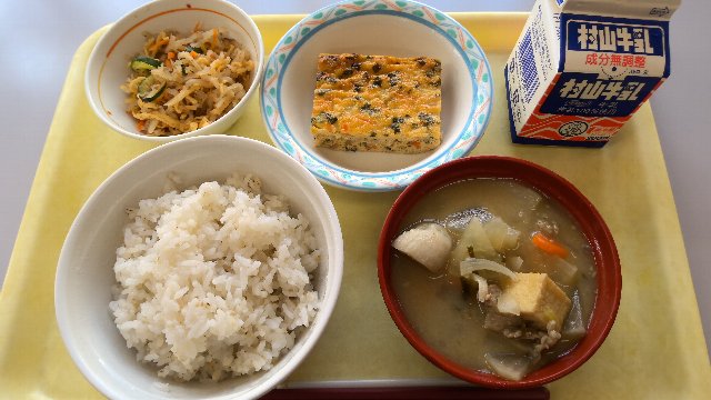 麦ごはん、牛乳、五目たまご焼き、切干大根のすだちポン酢和え、豚汁 763kcal