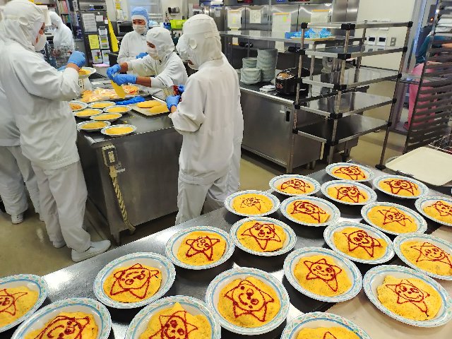 色んな表情をした可愛いぴからちゃんオムライスが、ずらりと並ぶ食堂のカウンターでは、子どもたちも先生たちも、笑顔で受け取る様子がたくさん見られました😊