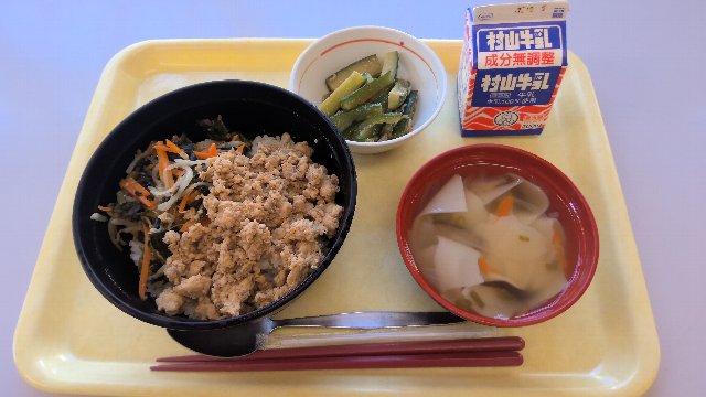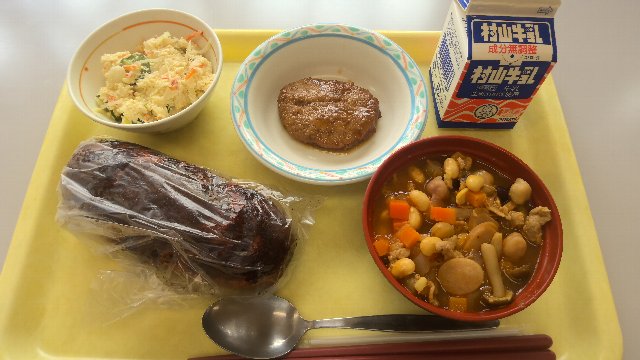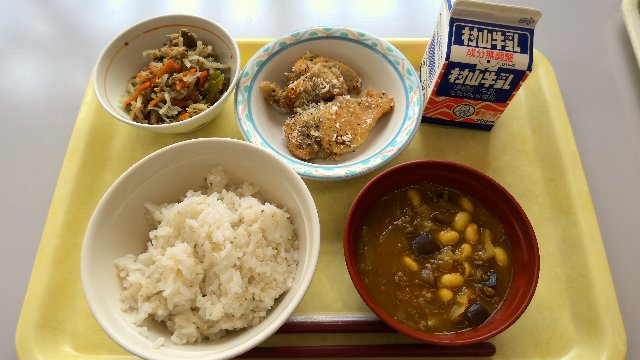 麦ごはん、牛乳、鶏肉の香草焼き、ツナとごぼうの塩きんぴら、県内産大豆入りカレースープ 836kcal