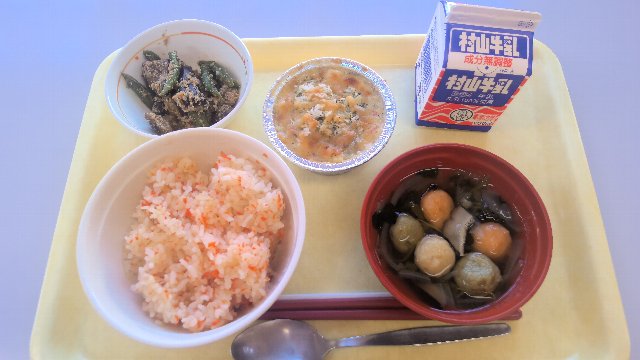 人参ごはん、牛乳、秋鮭ときのこのみそグラタン、なすのごま和え、三色つみれのすまし汁 760kcal