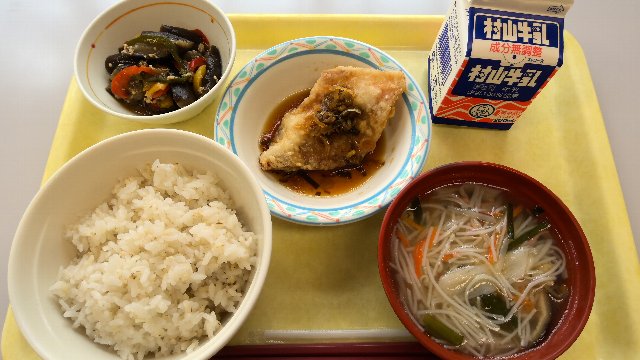 麦ごはん、牛乳、揚げ魚のねぎソース煮、なすとピーマンのオイスターソース炒め、汁ビーフン 765kcal