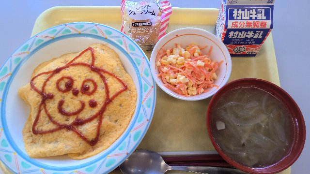 ぴからちゃんオムライス、牛乳、人参サラダ、オニオンスープ、プチシュークリーム 851kcal