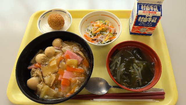 中華丼、牛乳、バンサンスー、わかめスープ、ごま団子 828kcal