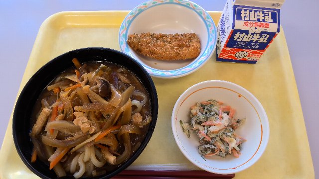 みそうどん、牛乳、ホキのフライ、茎わかめのサラダ 719kcal