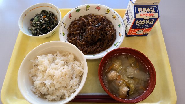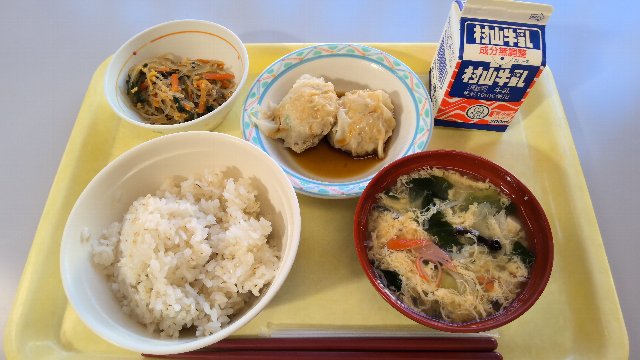 麦ごはん、牛乳、しゅうまい、チャプチェ、チンゲン菜とたまごのスープ 743kcal