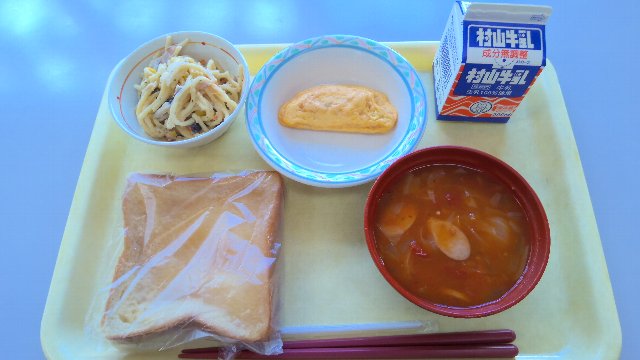 はちみつレモントースト、牛乳、ツナマヨオムレツ、きのこクリームスパゲッティー、ミネストローネ 886kcal