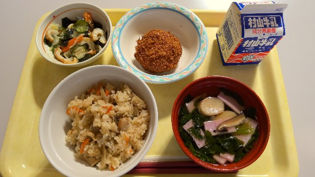 かしわ飯、牛乳、かぼちゃとさつま芋のコロッケ、酢みそ和え、すまし汁 800kcal