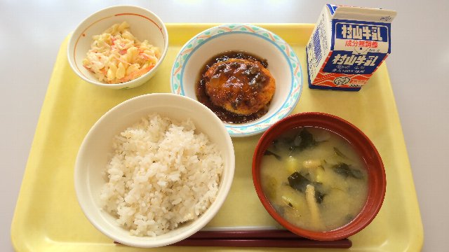 麦ごはん、牛乳、豆腐ハンバーグ、マカロニサラダ、みそ汁 804kcal