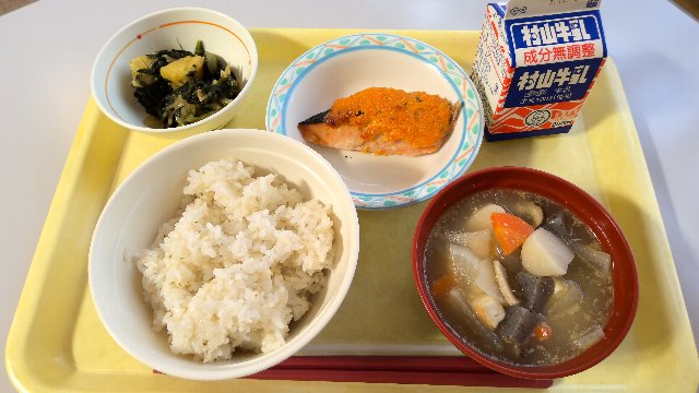 麦ごはん、牛乳、秋鮭の黄金焼き、さつま芋とほうれん草のバター醤油炒め、ごまけんちん汁 753kcal
