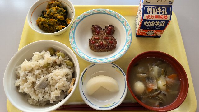 芋名月の里芋ごはん、牛乳、お月見うさぎのハンバーグ、かぼちゃのおよごし、お月見だんご汁、果物(県内産の梨) 737kcal