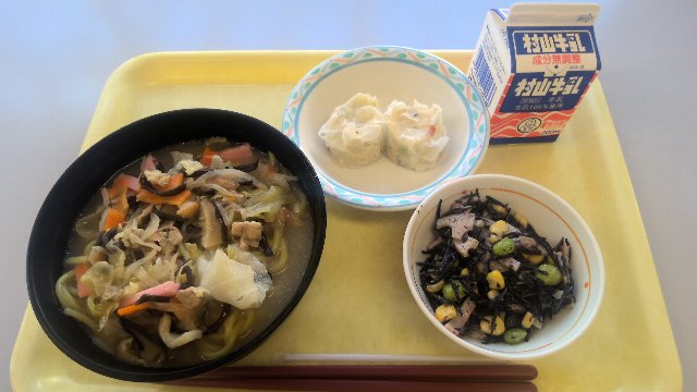 ちゃんぽん、牛乳、豆腐しゅうまい、れんこんとひじきのサラダ 776kcal