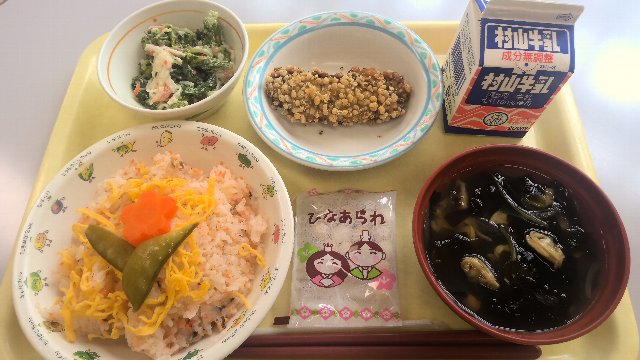 今日の給食でも、子ども達みんなの健やかな成長と幸せを願って、桃の節句にちなんだ献立が登場しました😋