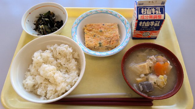 麦ごはん、牛乳、ツナとチーズのたまご焼き、磯香和え、みそちゃんこ汁(えび団子入り) 744kcal