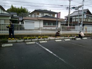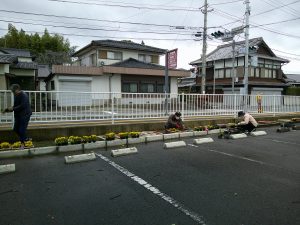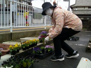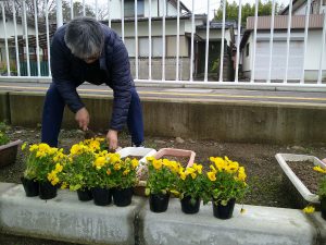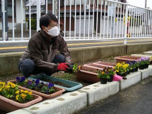 3月3日、防犯ボランティアの中村さんご夫妻と中原さんが、卒業生へのお祝いの気持ちを込めて、たくさんのプランターに心を込めて花を植えてくださいました。