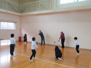 最初はうまくできなかった子どもたちも、優しく声をかけてもらいながら何度も挑戦し、「できた!」「もっとやりたい!」と嬉しそうな様子でした。老人会の皆様も、子どもたちの元気な姿に目を細め、温かく交流してくださいました。