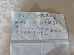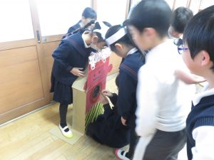 HOME > 教育活動 > イベントギャラリー(校長室ブログ) > 【3年】学活:節分パーティー👹 【3年】学活:節分パーティー👹 入力日2026年2月2日 閲覧数44 2月2日、3年2組でも子どもたちの企画・準備による節分パーティーが開催されました。 2組さんからも招待状をいただいたので、喜んで参加させていただきました。 グループで工夫を凝らして、遊びコーナーを作って紹介していました。 みんなでそれぞれの遊びを体験し、クラスの仲がより深まったことでしょう🎵笑顔いっぱいでした⭐ 前へ 一覧へ戻る 次へ