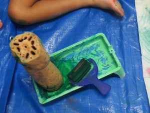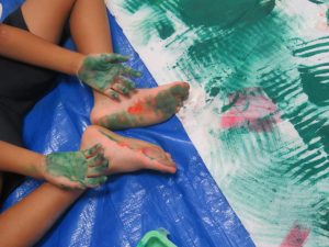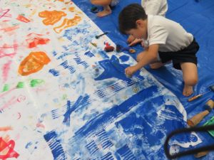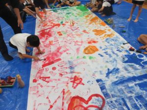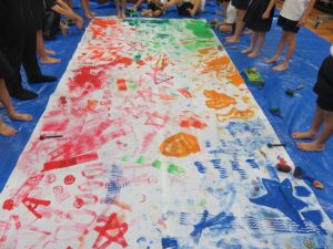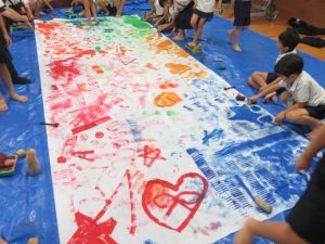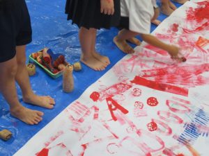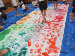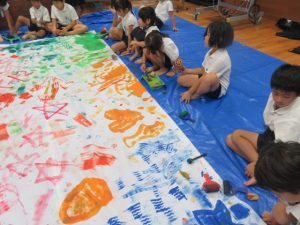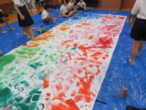 HOME > 教育活動 > イベントギャラリー(校長室ブログ) > 【1年】図工:楽しい世界 【1年】図工:楽しい世界 入力日2025年10月10日 閲覧数98 10月10日、6年生の先生が1年2組の教室で、乗り入れの図工の授業を行ってくださいました。 子どもたちは、とても大きな白い障子紙に、ローラーやはけ、レンコン、筆など、さまざまな道具を使って模様を描いていました。中には、足形で表現する子もいて、教室中が楽しさと笑顔であふれていました。 自分の好きな色で思い思いの世界をつくり出す子どもたちの姿が、とても印象的でした。 先輩の指導技術を後輩に継承していく、先生たちも学び合いが素晴らしいです。 前へ 一覧へ戻る 次へ