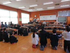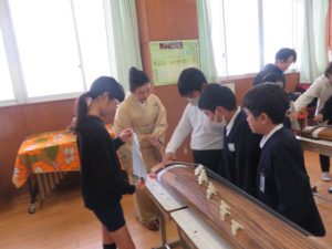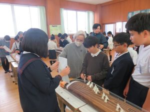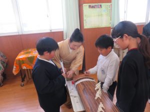 12月12日、5年生は、音楽の学習で「日本の和楽器 お筝を聴く・お筝を弾く楽しみ!」を開催しました。 桜奏の会の皆様を講師にお迎えし、「筝」にふれる体験です。はじめに「春の海」の演奏を鑑賞しました。お筝の演奏を生で見るのが初めてという子どもも多く、美しい音色や迫力ある演奏に、子どもたちは集中して聴き入っていました。その後、お筝の仕組みや演奏方法について教えていただき、実際に「さくらさくら」の体験演奏にも挑戦しました。爪をつけて初めてお筝を弾いた子どもたちは、とても嬉しそうで、笑顔があふれていました。 桜奏の会の皆様、本日は丁寧で温かいご指導をいただき、誠にありがとうございました。