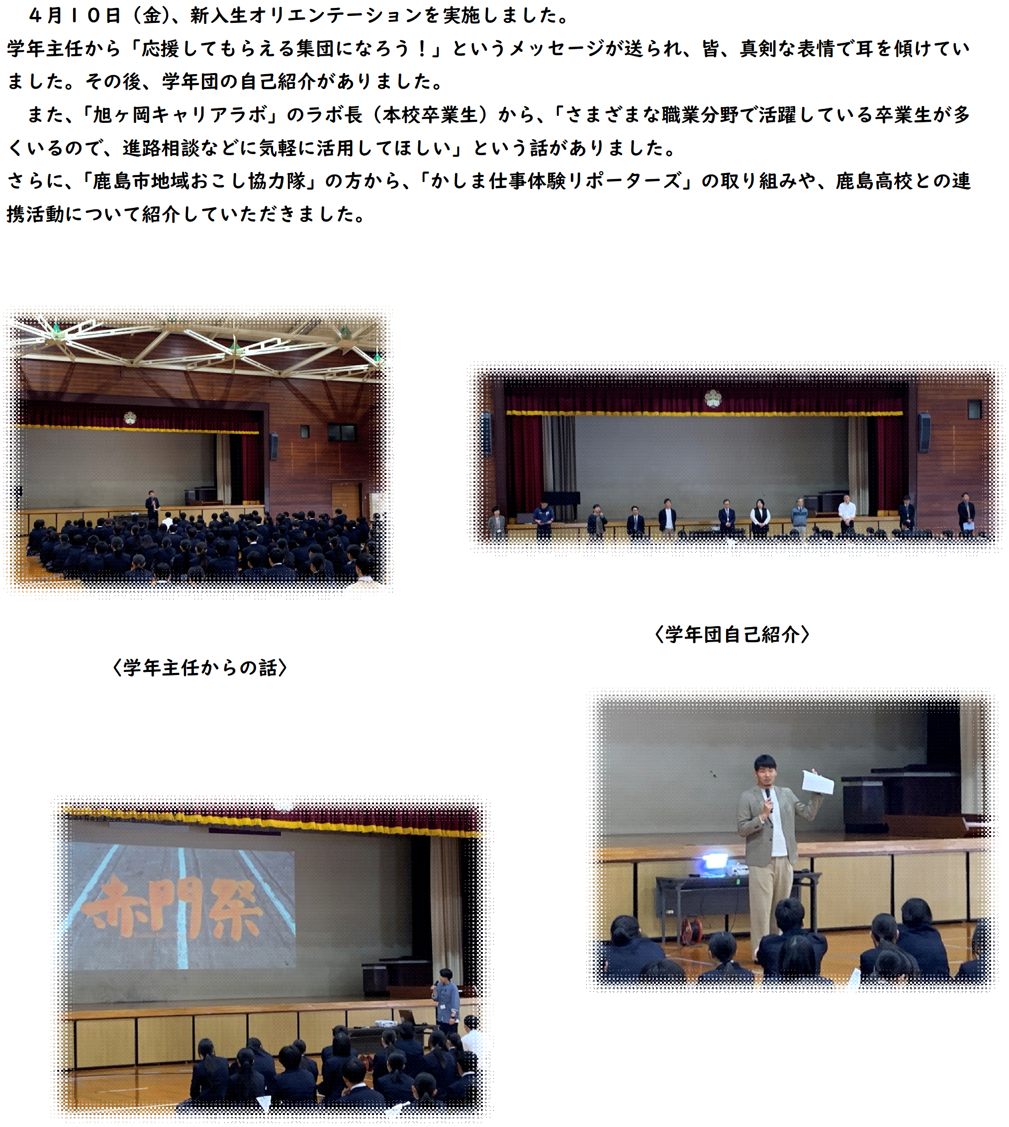 HOME > 学校紹介 > イベントギャラリー > 1年生オリエンテーション~学年集会・旭ヶ岡キャリアラボ・鹿島市地域おこし協力隊紹介~ 1年生オリエンテーション~学年集会・旭ヶ岡キャリアラボ・鹿島市地域おこし協力隊紹介~ 入力日2026年4月27日 閲覧数38 前へ 一覧へ戻る 次へ